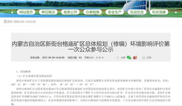 第一次公眾參與2021年6月4日在鄂爾多斯市能源局網站向當地公眾公布了有關環境影響評價的信息以便讓公眾知悉,公示時間期為10個工作日。公示情況見下圖。