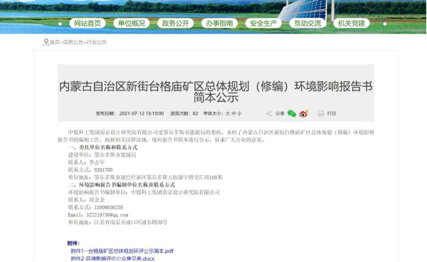 2021 年7月12日在鄂爾多斯市能源局政府網上進行了第二次信息公示,同時在公示中附上了查閱報告書征求意見稿及公參意見表的公示鏈接,征求公眾對報告書征求意見稿的相關意見,公示時間共計為10個工作日。向公眾公告以下信息: